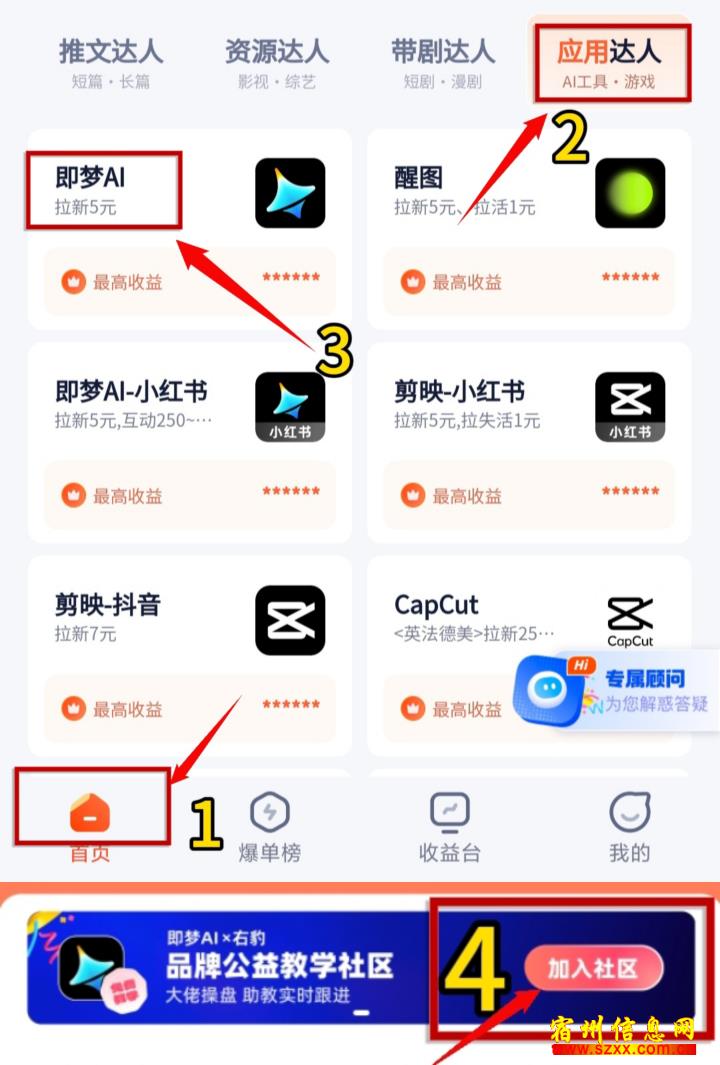 ①在首页找到应用达人