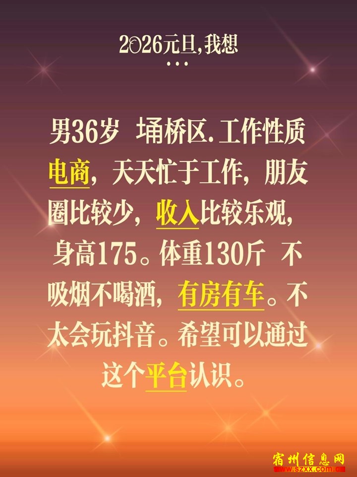 本人男,36岁,身高175 离异,宿州埇桥离异,区本地人,在某区本地平台在电商卖货平台在,朋友圈比较少,朋友,天天忙于工作,天天。所以一直这样。所以拖着。2026拖着。年了。希望今年年了。可以遇到对的那个她