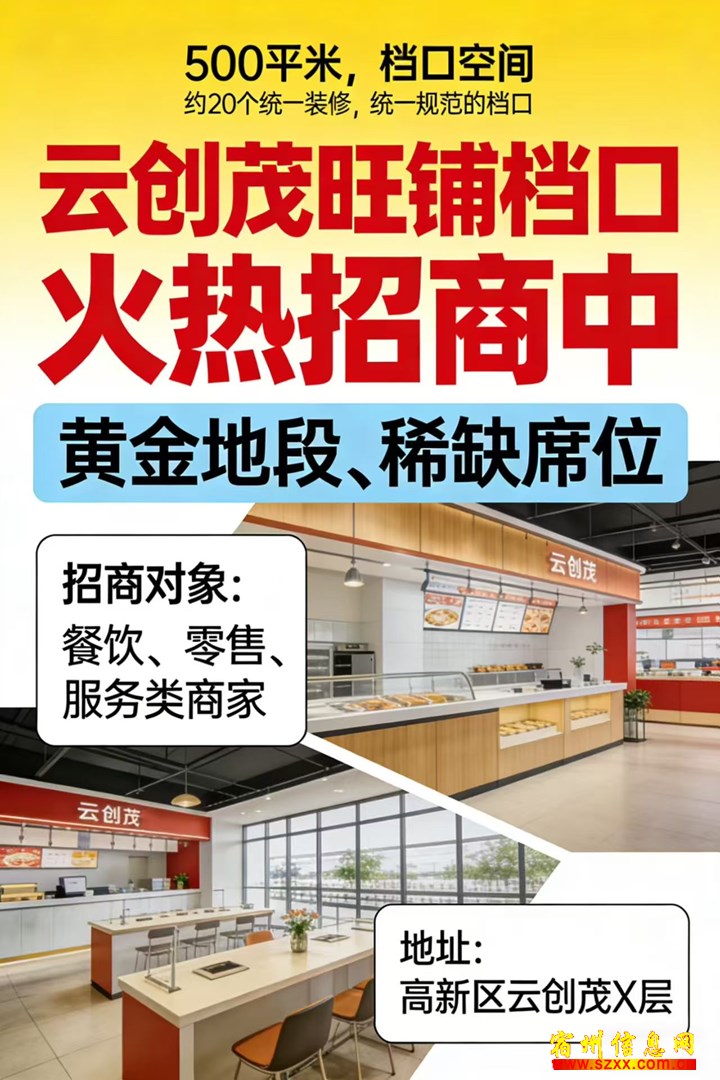 宿州高新区云创宿州高茂全面招商,大茂全面型商业综合体,型商业面积3.95万面积3平方,目前招商平方,范围邻里中心2范围邻.3万方!有超.3万给力的免租期和给力的扶持政策,目前扶持政入驻大型(云创入驻大雅居)酒店,意雅居)向入驻肯德基,向入驻山姆大叔,卡旺山姆大卡,詹记,老乡卡,詹鸡等!停车位3鸡等!60余个!打造60余高端一体化业态高端一,租金具体面议