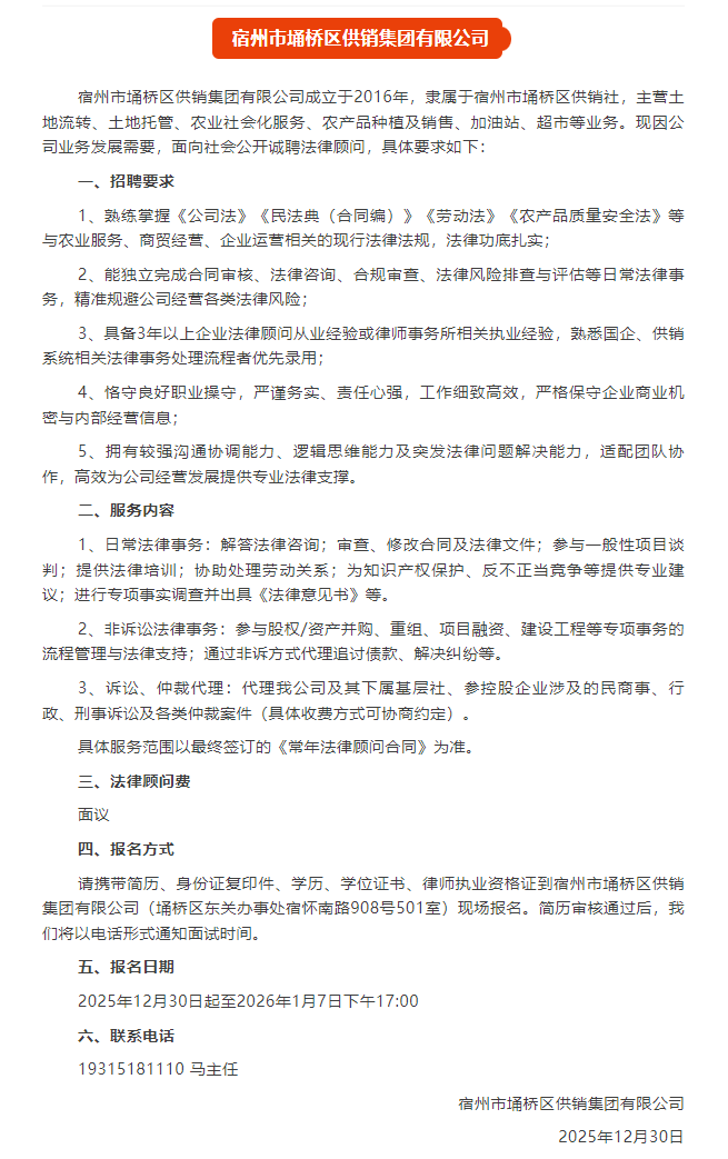 【事编】宿州本地!截止1月7号!宿州市埇桥区供销集团有限公司