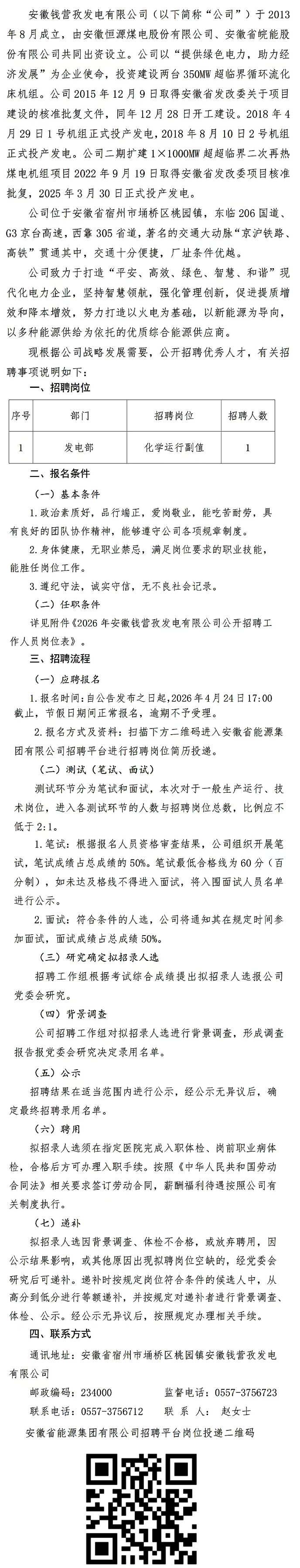 宿州市桃源镇,钱营孜发电有限公司招聘